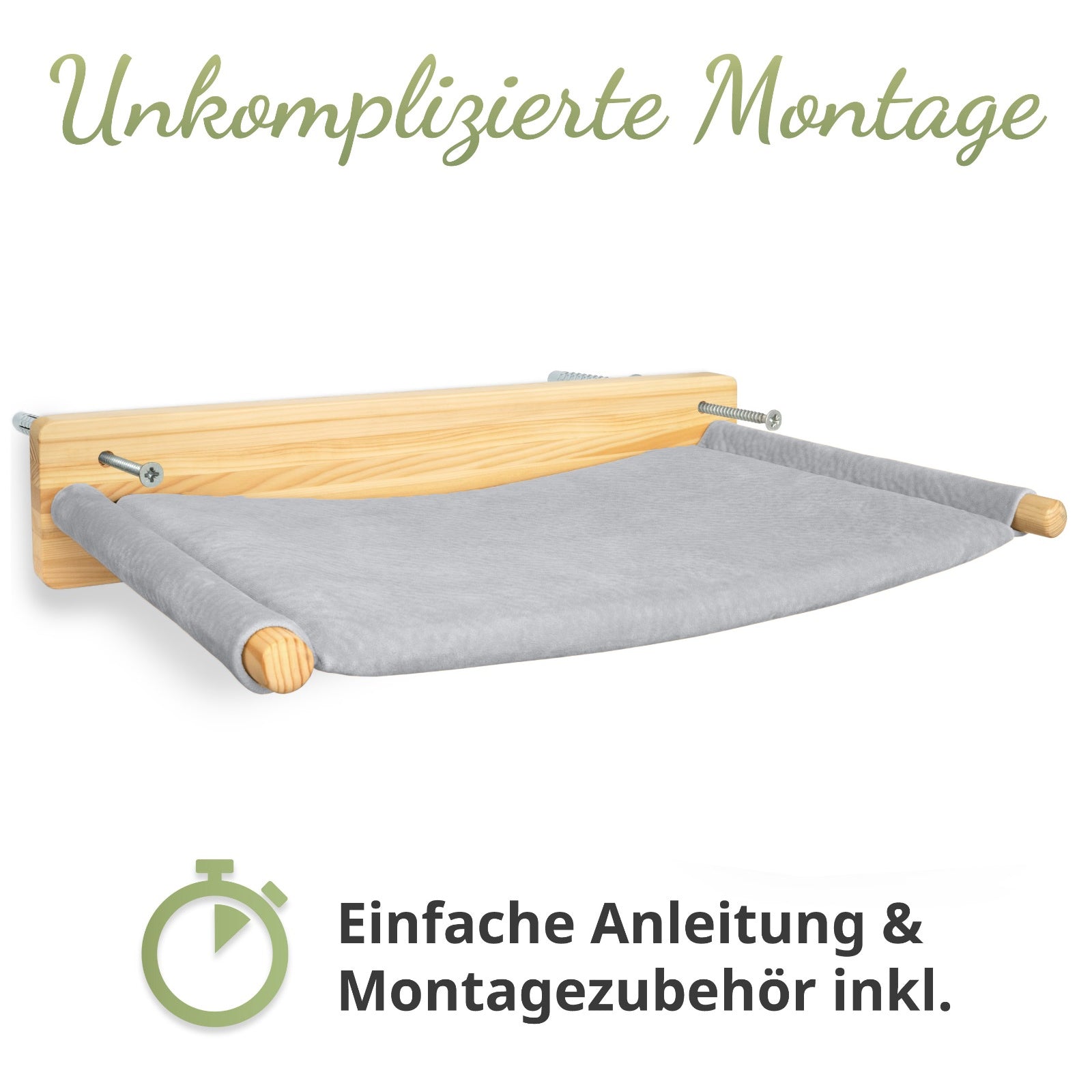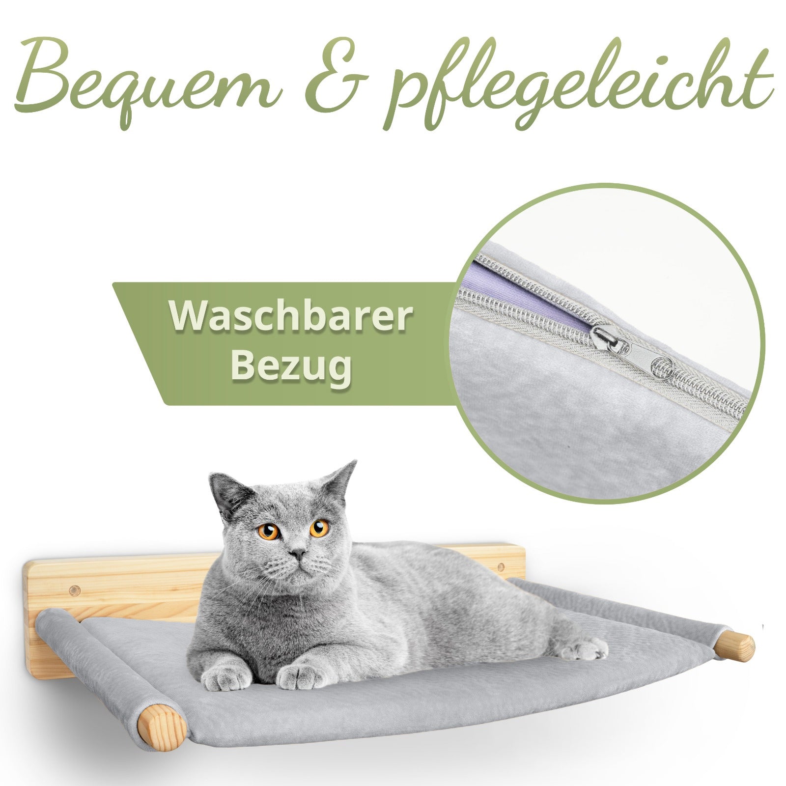 Unsere Katzenhängematte in Grau ist eine zeitlose Wahl, die sich nahtlos in jedes Wohnambiente einfügt und einen Hauch von Eleganz verleiht.